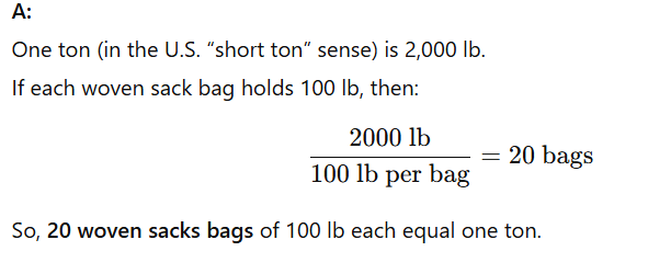 How many woven sacks bags (100 lb each) make up one ton?